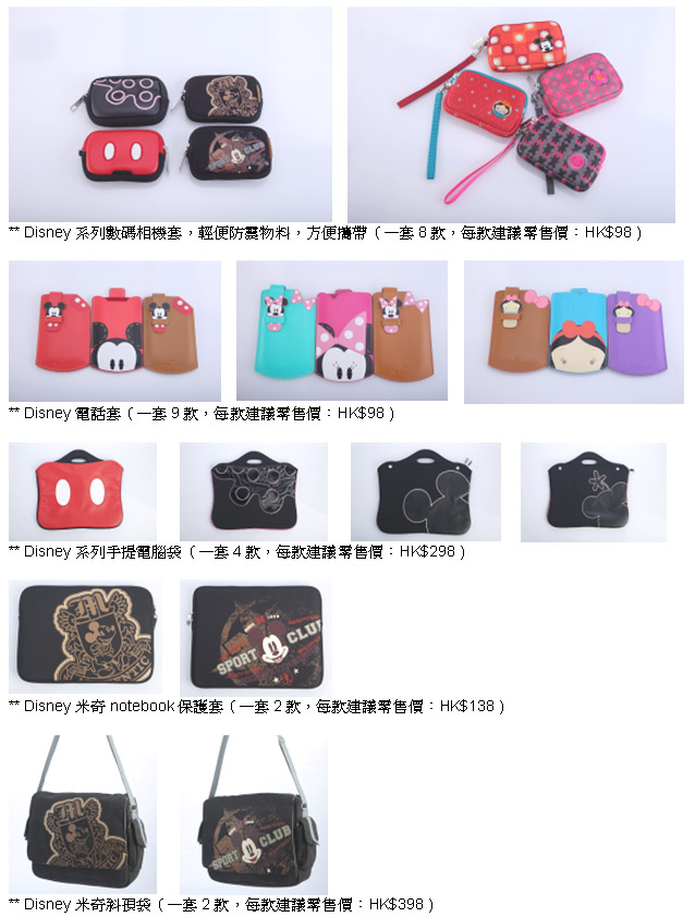 此外,MW亦同時推出了Disney數碼相機套、手提電腦袋、電話套、notebook保護套及斜孭袋,分別有米奇、美妮及卡通版白雪公主設計,美觀與實用兼備,Disney粉絲不容錯過。
