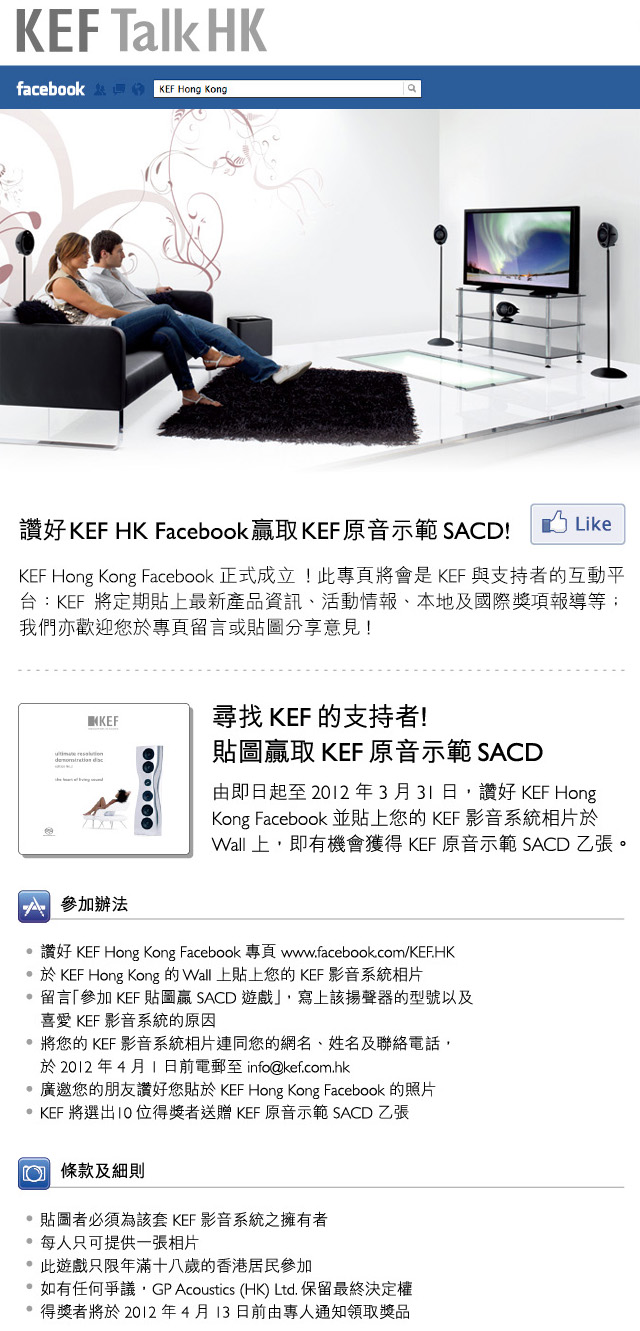 為慶祝KEF香港專頁成立,KEF特別推出香港專頁讚好活動。KEF支持者只須由即日起至3月31日讚好 KEF 香港專頁,貼上家中的KEF影音系統相片,留言「參加KEF貼圖羸取SACD遊戲」,寫上該掦聲器型號及喜愛KEF影音系統的原因,再將個人資料電郵至 [email protected] ,即有機會得獎 。KEF將會選出10位得奬者,送贈KEF原音示範SACD乙張。既可交流心得,又有機會贏取奬品,實在是所有音響愛好者不可錯失的活動!