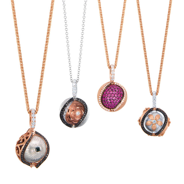立體花圖案的18K 玫瑰金外框,設計既優雅又時尚,而圓球的三面則以花卉圖案、眼睛造型及釘鑲鑽石作綴飾,三面獨特的設計可配襯型格或高貴的造型,mix and match不同效果。