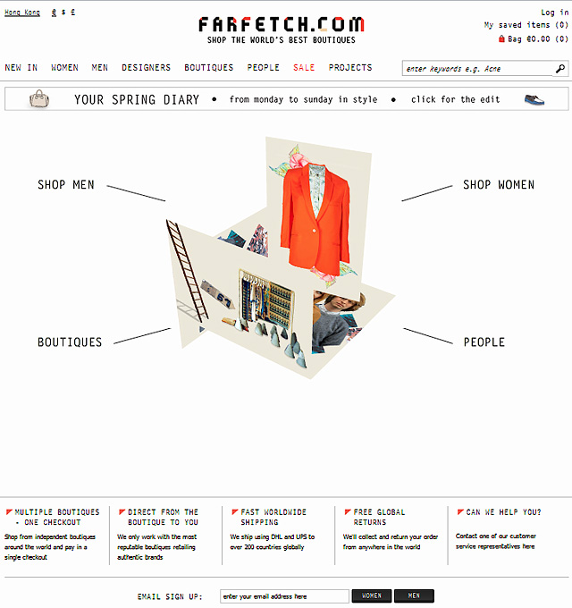 Farfetch.com是一個獨特、多元化而富品味的網上購物中心,網羅超過100家獨立時裝店,提供超過1000個著名品牌及有待發掘的新晉設計師。Farfetch.com的時裝來自世界各地,包括時裝重鎮巴黎、紐約、米蘭、巴塞隆拿及其他潮流城市。