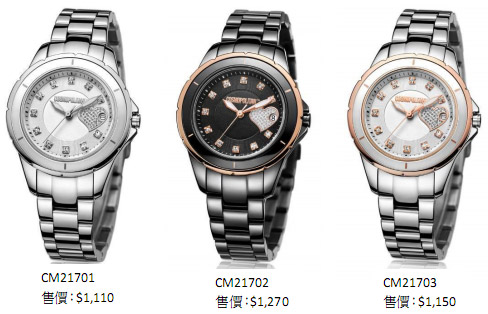這一系列全新的Cosmopolitan 夏季女裝腕錶以水晶代替數字的刻度,以全施華洛世奇水晶圍繞錶殼造型,穩重而不失優雅。加上實用的三眼設計,分別顯示日曆、星期與小時,方便各位正在為事業衝刺的女性爭分奪秒。系列分別有三種顏色選擇:銀色、黑色及玫瑰金色,當中銀色腕錶以俏皮清新的粉紅色條紋錶盤點綴,增添少女氣息。