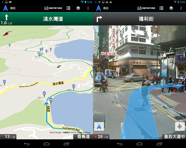 而Google地圖更提供實時交通路面資料,好讓身處在交通繁忙的香港用戶,可以時刻緊貼路面情況。用戶只要選擇「路況檢況」的模式,就可以從熒幕上顯示的綠色、黃色、紅色或黑色指示 ,知道最暢通以至最擁擠的路面情況。當發現某條主要公路出現大擠塞,用戶可透過導航系統尋找另一條最快捷的替代路線,方便避開擠塞的道路。