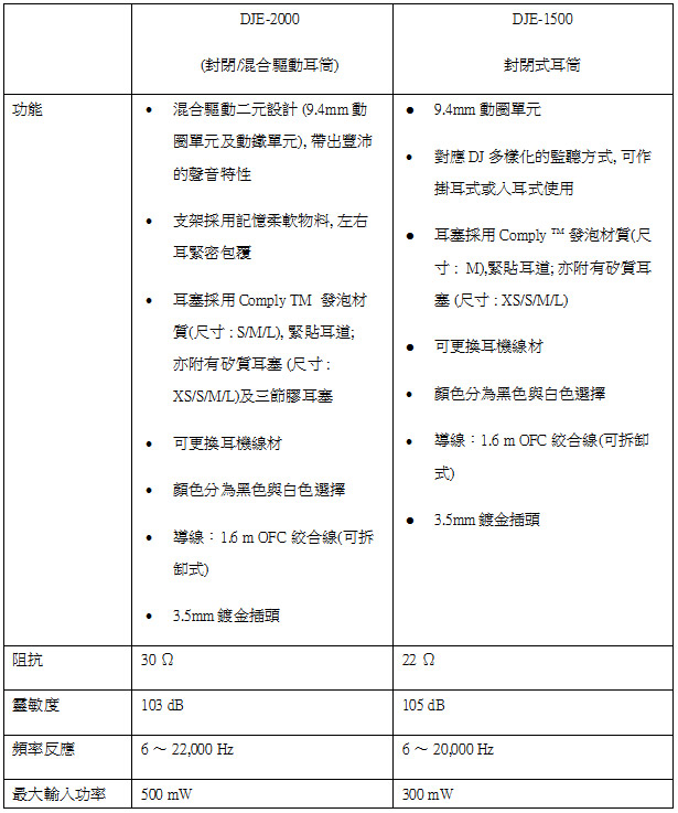 DJE-2000 採用混合驅動二元設計,配備9.4mm 動圈單元及動鐵驅動設計, 帶出強勁的低音之餘又能帶出豐沛的中高音。DJE-1500則備有9.4mm 動圈單元, 音質清晰。兩款耳機支援DJ多樣化的監聽方式,分別為入耳或與掛耳式, 在配戴時更隱固。