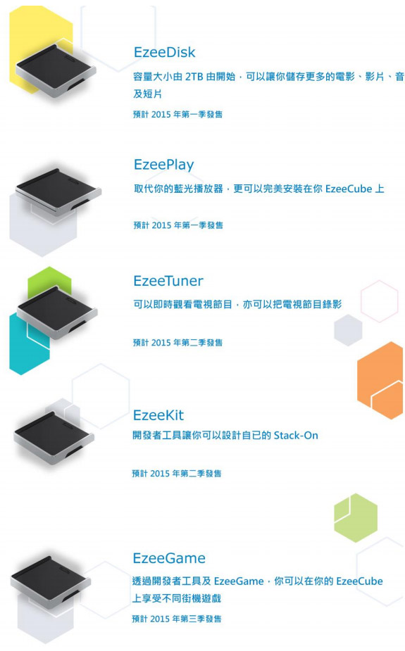 即使EzeeCube 擁出色的模組化設計,但若沒有多元化的 Stack-ons模組亦不能好好發揮。我們首要的任務是把 EzeeCube 交到你們手中,在此之後,其他的Stack-ons模組亦會緊接著推出!基於EzeeCube 運行的XBMC採用開源設計,因此Stack-ons配件六建立於開源的架構當中,用家可以自行設計 EzeeCube Stack-ons模組,讓你創造屬於自己的EzeeCube!