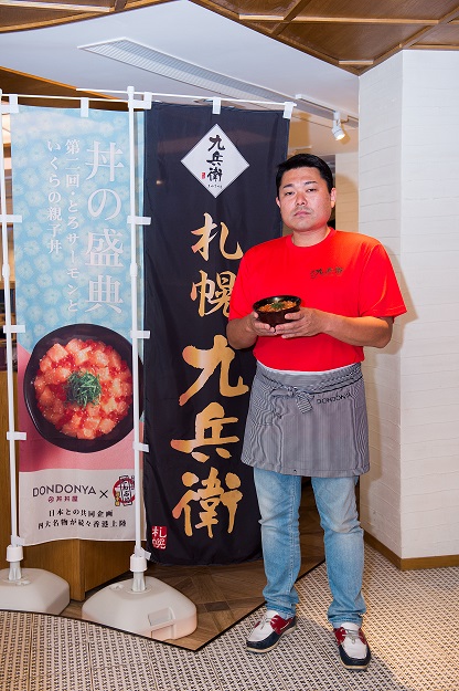 「九兵衛三文魚親子丼」誕生於北海道的「札幌九兵衛」。自2004年創辦以來,野崎社長堅信員工於工作時保持愉快的心情,才能為客人帶來快樂的用膳體驗,因此一直十分重視員工的福祉,甚至親自炮製員工膳食,深得員工喜愛,而「九兵衛三文魚親子丼」正是其中之一。野崎社長親自製作的「九兵衛三文魚親子丼」,除了讓他曾在不同美食祭中取得佳績外,更於首次參選2016年「日本丼物選手權」中獲得極高人氣,丼飯愛好者絕對不能錯過。他說道:「與丼丼屋合作是一個很難得的機會,亦希望藉著這次機會首度將『九兵衛三文魚親子丼』帶到海外,希望香港的朋友會喜歡。」