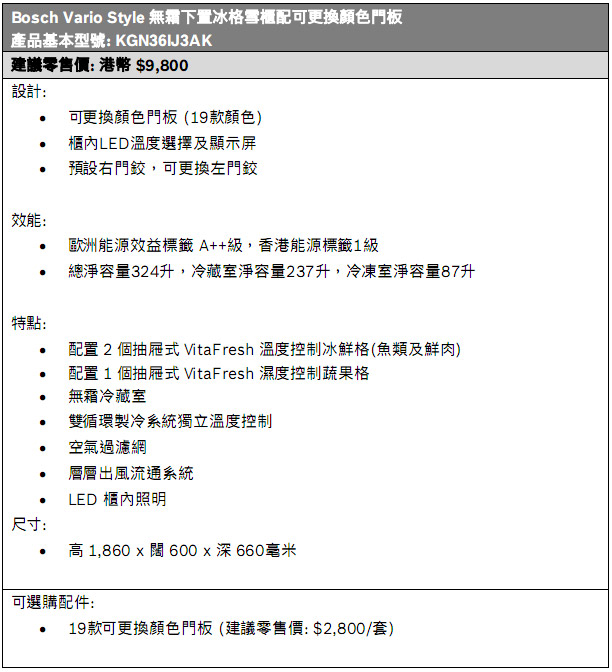 廚房不僅是一個烹調美食的地方,更是派對或與家人共享美食的場所。雪櫃作為存放食物及飲料的地方,是廚房的中央樞紐,在任何場合都是焦點所在,特別是作獨立式擺放時。Bosch Vario Style 無霜雪櫃,配備可更換顏色門板,為您提供多達 19 種顏色選擇,讓您可輕鬆地隨時轉換雪櫃門板的顏色,不論您追尋大膽、充滿活力或季度流行的顏色,以至低調沉實的顏色選擇,Bosch Vario Style 雪櫃均可滿足您的需求,讓您的廚房真正展現出您獨特的個性。