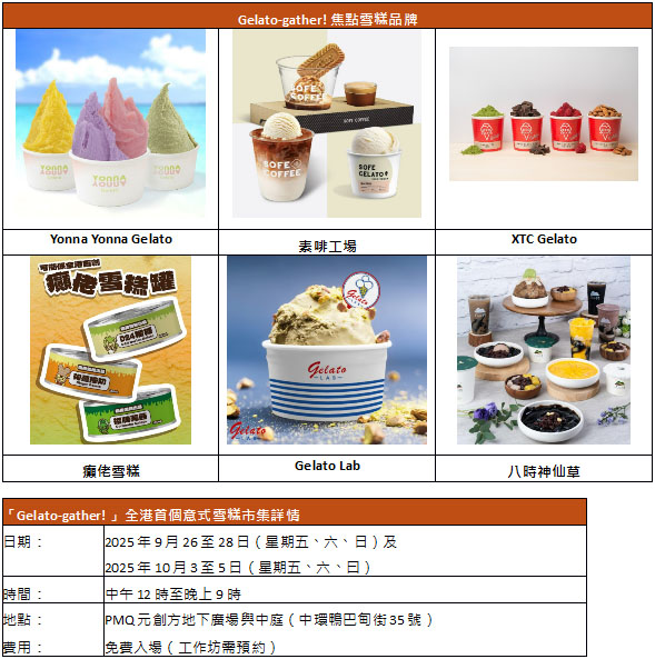 今個9月下旬,PMQ 為你集結本港多間人氣意式雪糕店!全港首個意式雪糕市集「Gelato-gather!」帶來超過30款特色風味 Gelato,同時亦有文創產品、寵物用品、工作坊等,迎接甜蜜初秋細味品嚐意式雪糕冰涼的甜蜜滋味,一同集結 PMQ ,重整生活節奏,打造都市人專屬的快樂儀式!