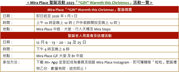 Mira Place 更推出一系列精彩聖誕消費禮遇,大派總值超過HK$50萬的聖誕禮物及獎賞,包括「賞您暖『粒粒 』」遊戲送出超過3,000 份聖誕禮物,以及盡享近30 個商戶的獨家聖誕優惠低至半價等,與至愛親朋今個聖誕食、玩、買及打卡都充滿窩心暖意!