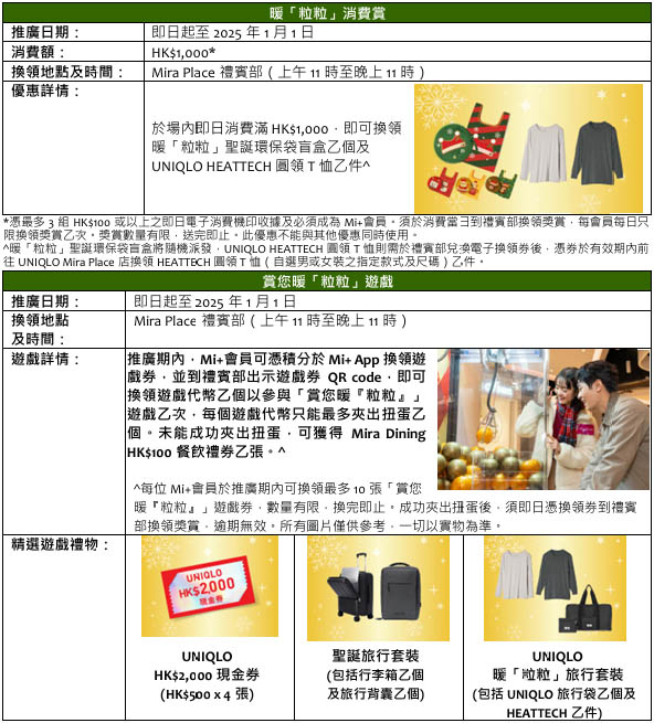 聖誕活動期間,Mira Place 更大派超過HK$50萬聖誕禮遇!①於場內即日消費滿 HK$1,000(最多3 組HK$100 或以上之即日電子消費機印收據及必須成為 Mi+會員),即可換領暖「粒粒」聖誕環保袋盲盒乙個及UNIQLO HEATTECH 圓領 T恤乙件;②大派超過3,000份暖「粒粒」聖誕禮物!Mi+會員可憑積分換領UNIQLO HEATTECH 圓領 T恤,亦可換領「賞您暖『粒粒』」遊戲券到Mira Place 禮賓部旁邊的遊戲機即場夾走暖「粒粒」聖誕禮物,人人有獎!③參與社交平台小遊戲即有機會獲得Mira Place x UNIQLO 暖「粒粒」保溫杯乙個!今個聖誕,立即鎖定 Mira Place 多重聖誕禮遇,領取最溫暖窩心的聖誕禮物!