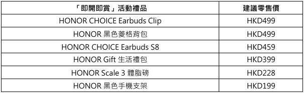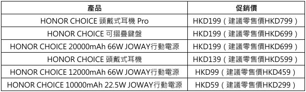 消費者亦可以於上述推廣期內,只要購買任何產品,即可以優惠價格換購以下HONOR產品乙個:
