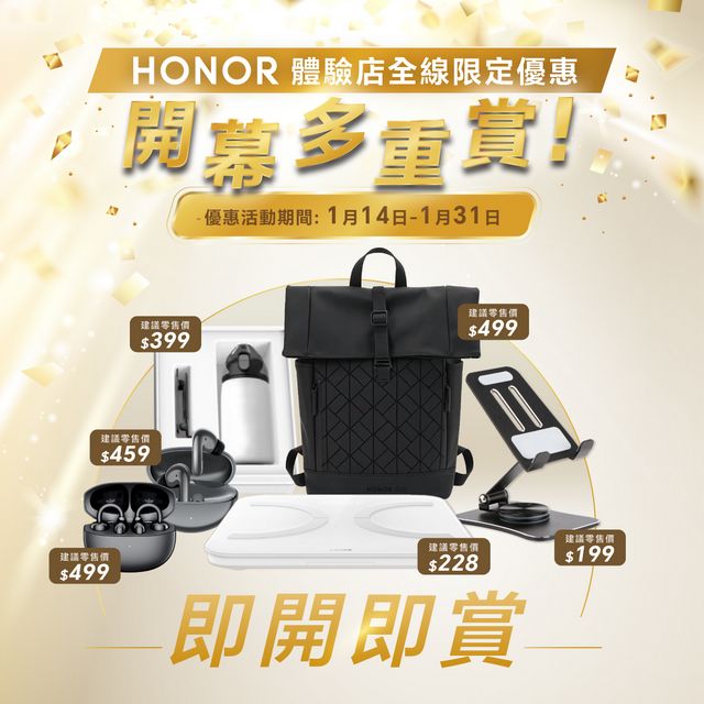 由即日起至1月31日,廣受消費者喜愛且驚喜不斷的HONOR「即開即賞」禮遇再度歸來!消費者凡在此期間到HONOR任何一間體驗店購買任何手機、平板或電腦,即可參與「即開即賞」活動,禮遇詳情如下