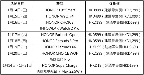為祝賀新店開幕,HONOR屯門體驗店由即日起至1月21日開展「超值搶購週」,多款 HONOR產品均設驚喜獨享價格,部份產品更低至1折發售,詳情如下: