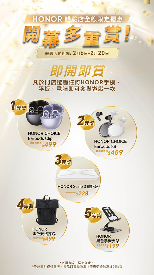 此外,消費者只要於上述推廣期內在HONOR任何一間體驗店購買任何手機、平板或電腦,即可參與「即開即賞」活動,禮品數量有限,送完即止。禮遇詳情如下: