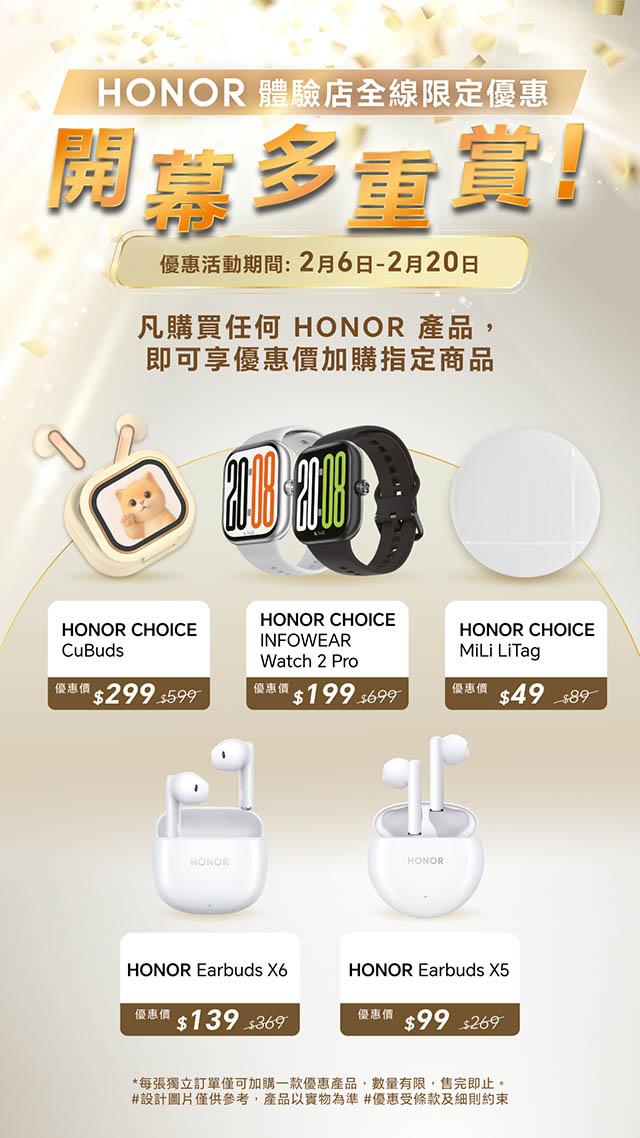 除HONOR葵芳體驗店外,HONOR亦於其餘4間體驗店推出驚喜優惠,由即日起至2月20日,消費者可於任何一間HONOR體驗店參與「開幕多重賞」及「即開即賞」禮遇活動!消費者凡在此期間到HONOR任何一間體驗店購買任何產品,即可以優惠價格加購以下HONOR產品乙個:
