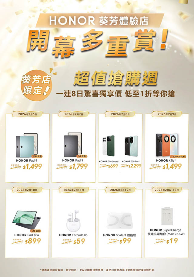 為祝賀新店開幕,HONOR葵芳體驗店由即日起至2月13日展開「超值搶購週」開業推廣優惠,多款HONOR產品均設驚喜獨享價格,當中消費者可以低至近半價的超值價格入手HONOR 200 Pro或HONOR 200 Smart智能電話,部分產品更低至1折發售。優惠詳情如下: