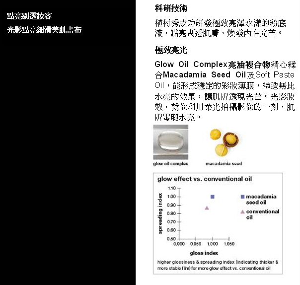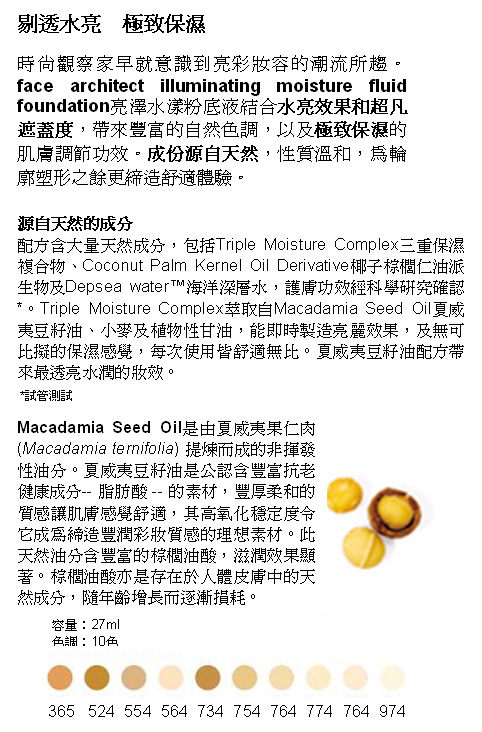 亮澤水漾粉底液 植村秀輪廓修飾底妝哲學 不同的臉龐;不同的需求 全新輪廓修飾粉底系列 以這彩妝哲學為基礎研發的全新植村秀face architect illuminating moisture fluid foundation亮澤水漾粉厎液,妝效尤如利用柔光拍攝影像的一刻,打造水亮零瑕美肌。