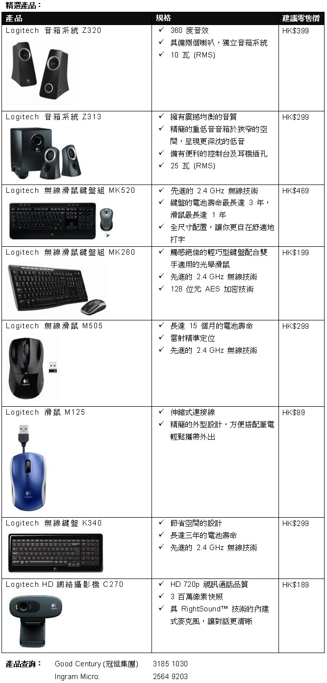 香港,二零一零年十一月三十日 — 佳節將至,還在費煞思量送什麼禮物給親朋好友?即日起至12月31日,於指定商店購買任何Logitech產品滿HK$499,將送你價值高達HK$499的Logitech神秘禮物一份!禮物數量有限,送完即止。Logitech精選產品包括Logitech音箱系統Z320、Logitech無線滑鼠鍵盤組MK520、Logitech HD網絡攝影機C270等。立即選購Logitech產品,於聖誕佳節送給親朋好友!