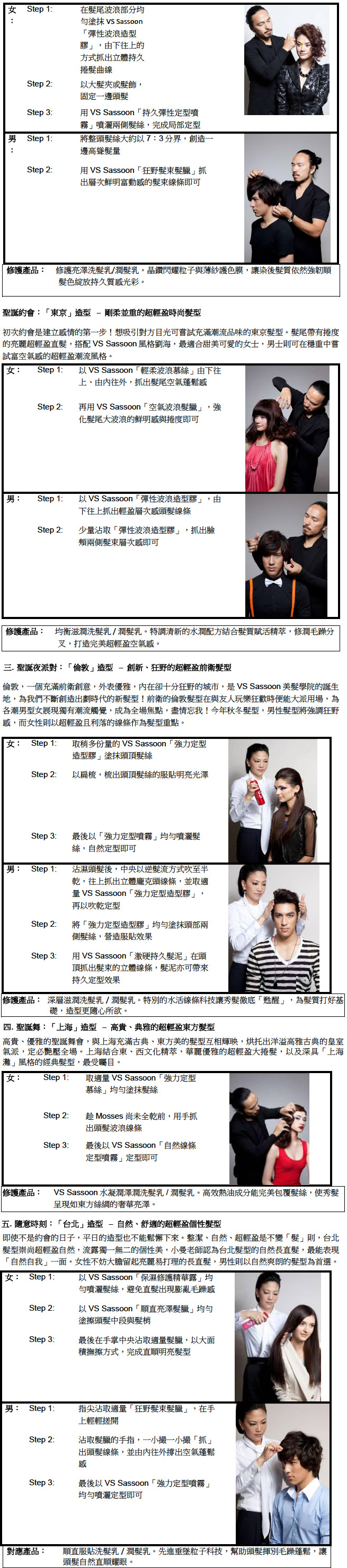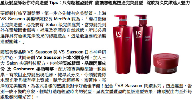 (香港‧2010年12月6日) 2010秋冬,結合聖誕、除夕等大型慶祝節日,少不了大大小小的慶祝派對,要突圍而出,在眾人群中綻放閃鑽光芒,美麗奪目的髮型是重要關鍵!VS Sassoon今年邀請到兩位品牌代言人︰Angelababy御用星級髮型師Carr Cheng,以及台灣最具影響力的時尚髮型教宗、《女人我最大》客席主持,小曼老師親身教授VS Sassoon 2010年最新超輕盈聖誕閃鑽造型。2010秋冬髮型,Carr與小曼均強調「超輕盈塑型 × 無重力空氣感」將會成為髮型的主流趨勢,今次兩位美髮達人會擷取五大VS Sassoon魅力時尚據點「香港、倫敦、東京、上海、台北」的時尚元素,配合各種不同聖誕派對場合,教你輕鬆打造超輕盈的時尚Party Look,呈現不同城市的百變風格!